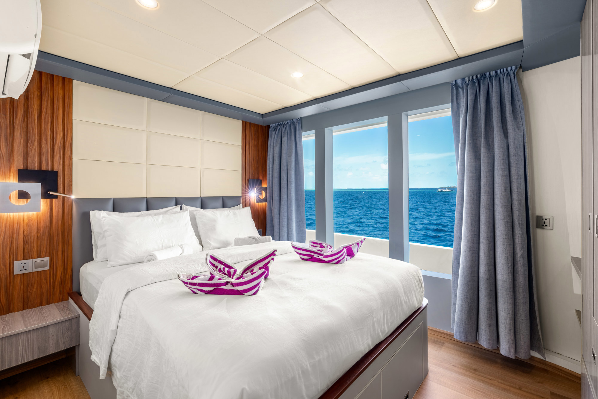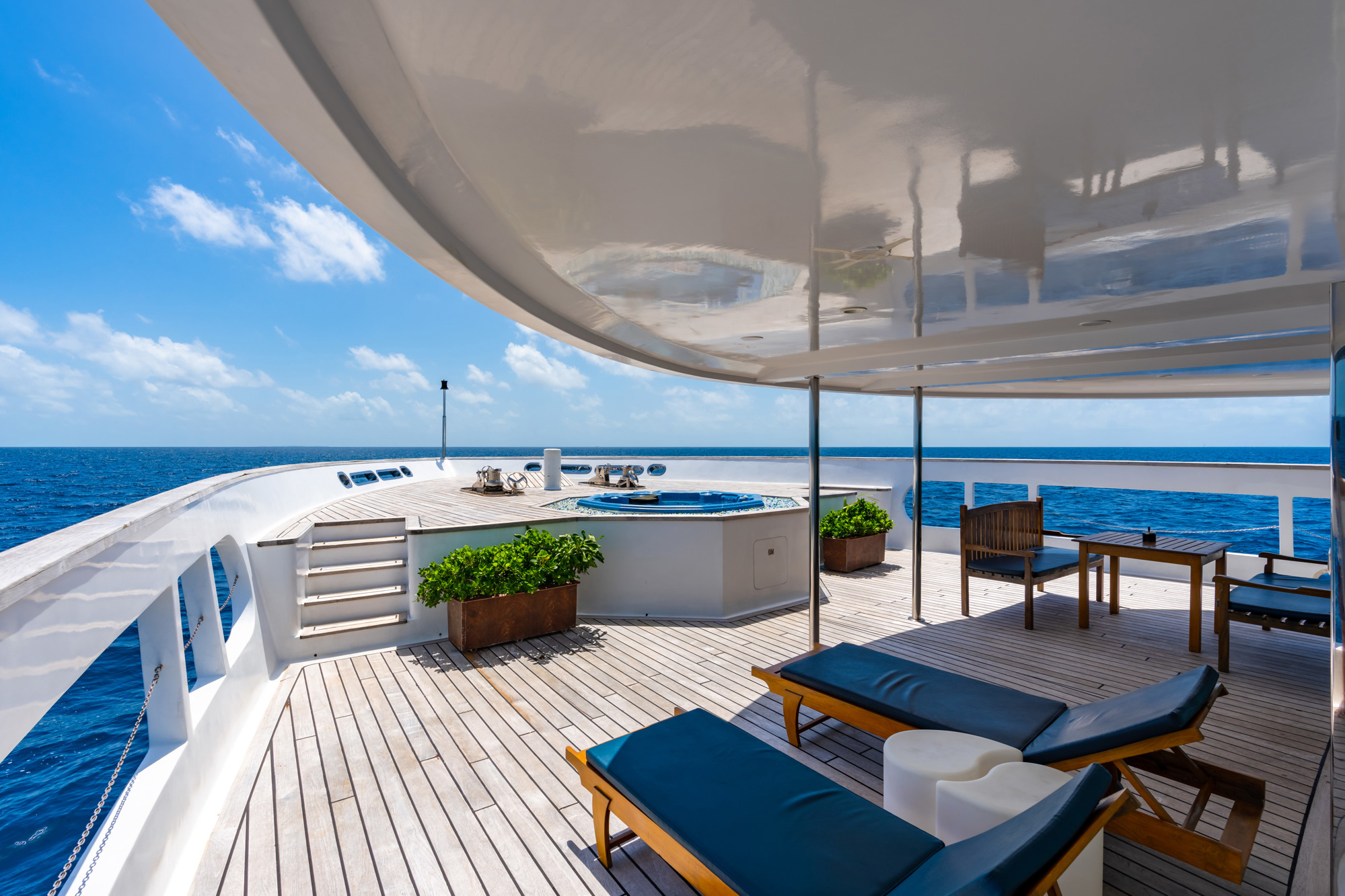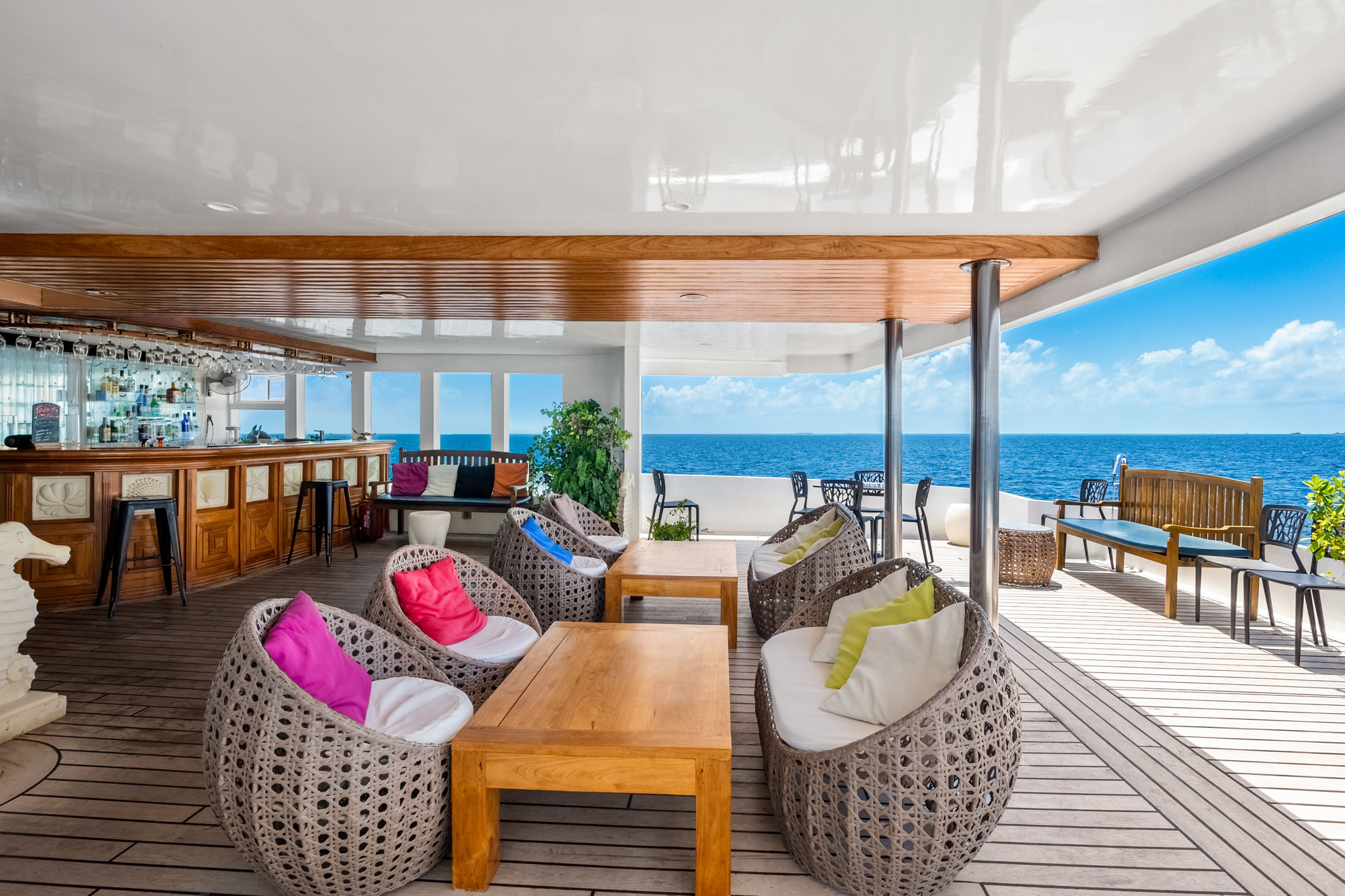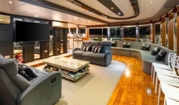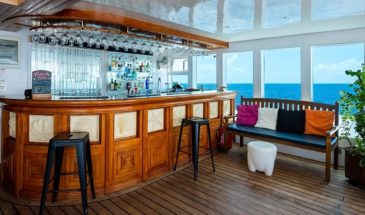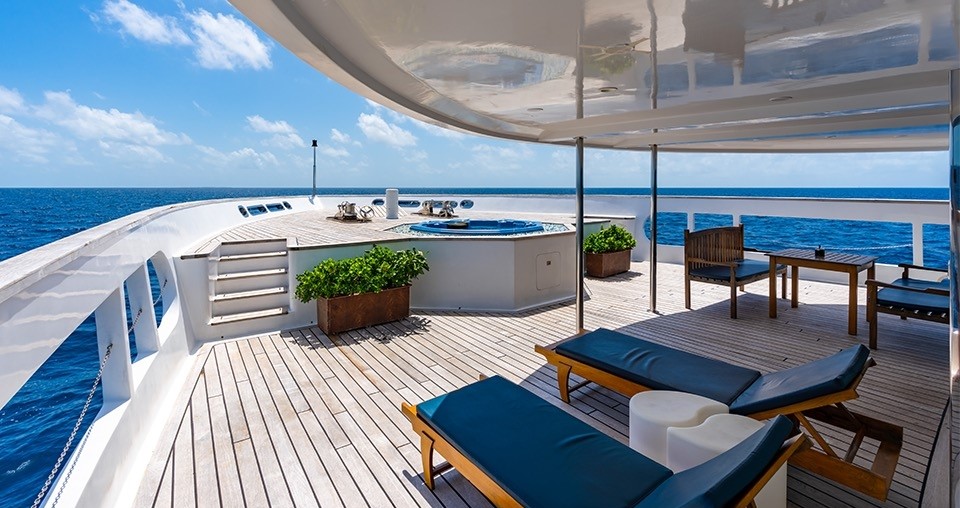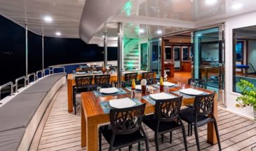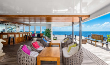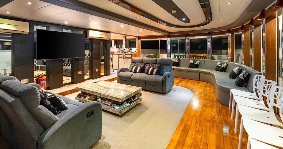 Les espaces en commun du bateau ont tout pour plaire. Plusieurs sundecks ensoleillés et ombragés équipés de chaises longues et des livres sont à disposition. Un jacuzzi à l'avant du bateau permet d'observer les beaux couchers de soleil et un bar est présent pour siroter un bon rafraîchissement. Il y a également un lounge intérieur équipé d'un grand écran plat.