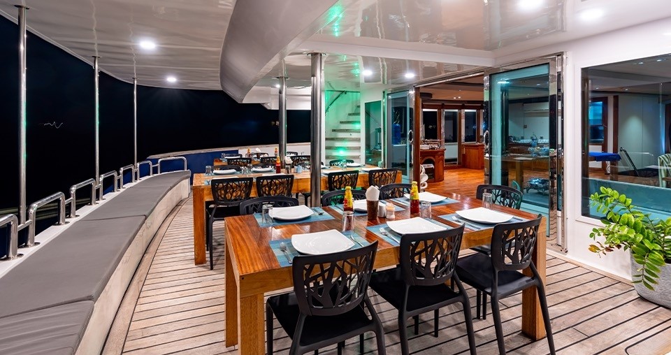 Tous les repas sont pris à bord. Des tables de 6 à 8 personnes en extérieur vous permettront de partager les repas en toute convivialité. Des plats locaux, occidentaux et végétariens sont proposés tous les jours sous forme de buffet.